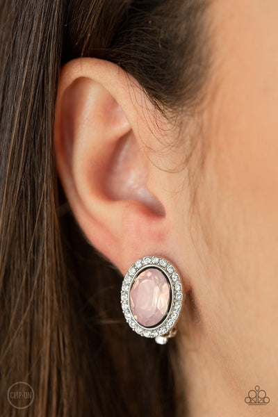 An opalescent pink gem is pressed into the center of a silver frame radiating with dainty white rhinestones for a refined flair. Earring attaches to a standard clip-on fitting.