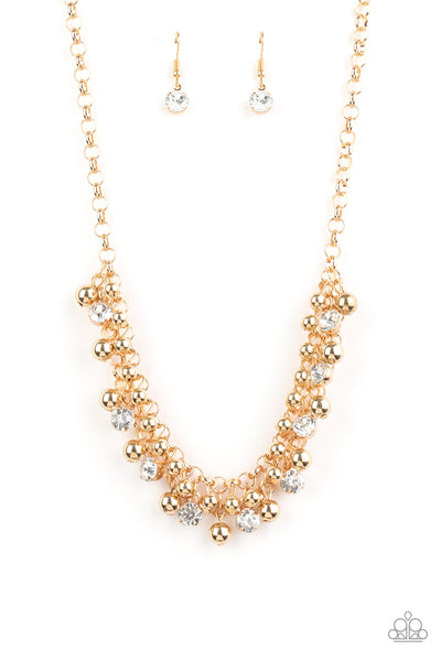 Classic gold beads and oversized white rhinestones trickle from the bottom of interlocking gold chains, creating a fierce fringe below the collar. Features an adjustable clasp closure.